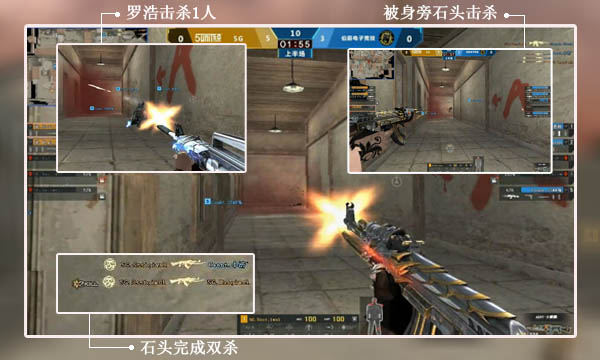 白鲨在CFPL S10对战SV时,石头的枪法的巨大威力就险让SV无法晋级决赛,他的AK水平在联盟中也属上乘。石氏枪法的最大特点就是,对敌人造成伤害的同时,必定对自己人造成更大伤害,正所谓“杀敌800,自损1000”……在TGA大奖赛其间对战伯爵电子竞技时,石头和罗浩从A小道发起进攻,伯爵电子竞技两名选手从A小道前压,狭路相逢勇者胜,罗浩率先击杀1人,身旁的石头突然使出“石氏枪法”第一式“一箭双雕”,闪身、射击、爆头行云流水的操作,成功将另外1名敌人击毙,无奈此招一出,必须死两个人,于是石头抱歉地看了一眼身边的罗浩……