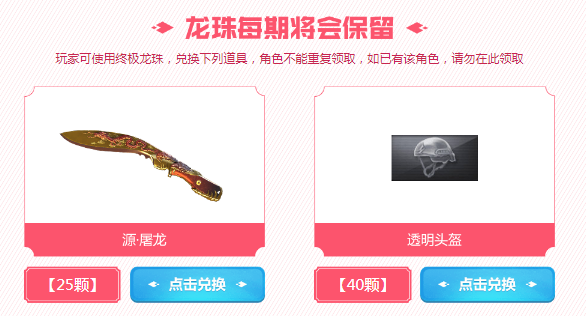 首先还是2个镇店之宝的兑换,本期迎来源·屠龙返场,仅需25颗终极龙珠即可兑换;错过透明头盔的同学依然可以使用40颗终极龙珠兑换。最后还是老规矩,期待一波“透明护目镜”加入龙珠兑换。