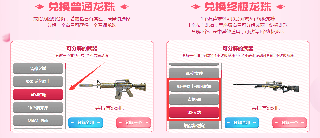 新增大量可分解的武器,完美解决爆仓问题!除了源·天龙、青龙·魂、御·黑骑士-哪吒闹海等源御魂武器已支持分解为终极龙珠以外,大家最感兴趣的莫过于首次加入“皇家雄鹰”武器的分解,这说明什么问题呢?当然是策划小哥哥一直在关注大家提出的建议啦,所以还希望同学们要多多提出宝贵意见和合理化建议,相信我们一定可以共同创造一个美好的CF世界。