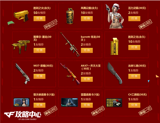 除了首次邀请之外,还可以通过继续邀请好友获取友情券来兑换礼包。如果能够成功邀请一位好友回归的话,不仅可以领取首次邀请礼包中的五张友情券,还可在这里再领取三张。也就是说,八张道具卡就已经到手了。当然了,对于已经不再对道具卡有兴趣的欧皇来说,八张友情券也可意味着30天的C4工具钳、丛林匕首、苍龙大炮、M37-恶棍、活力灵狐或是AK47-齐天大圣等任意组合。至于头奖也是极其的诱人,永久期限的胜利之火(限量5000),再也不必担心期限的迷彩***到期了!