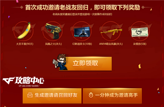 首先是邀请老战友回归。我们可以通过“生成邀请函召回好友”来生成二维码和链接,只要是最后一次游戏时间在2017年3月1日之前的好友均可接受邀请。当老战友接受邀请后在活动期间登陆游戏1次,即算作成功回归。而发送链接的玩家在首次成功邀请老战友回归之后,可领取永久的凤凰之火和AN94-暗金风暴,以及90天的大圣手雷和10张幻影道具卡,奖励不可谓不丰富啊!