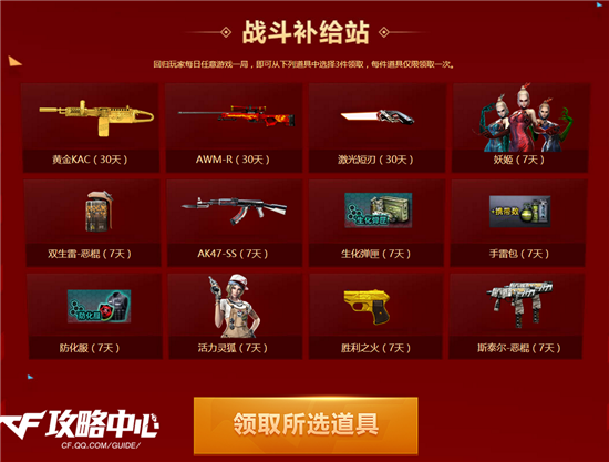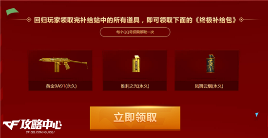 当然了,福利并没有到此结束,回归玩家还可以在每日任意一局游戏后从“战斗补给站”中选择三件来领取。其中不仅有妖姬、防化服、生化弹夹、手雷包这些实用道具,还包含了胜利之火、斯泰尔-恶棍、双生雷-恶棍等强力武器。除此之外,还有30天期限的黄金KAC、AWM-R和激光短刃在等着大家。在将补给站中所有道具领取完毕后,还可领取《终极补给包》:永久期限的黄金9A91、胜利之光和凤舞云烟!