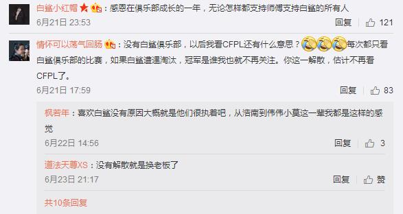 6月21日,由白鲨创建的以自己ID命名的“白鲨电子竞技俱乐部”宣布解散,粉丝们无不惋惜,在激烈的职业赛场上再也看不到那么一支熟悉的战队,那么一个蓝白色的鲨鱼logo,再也没有哪支队伍能够让他们热血沸腾地喊出“NICE!”与“加油!”。
