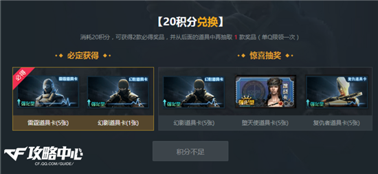 接下来依旧是道具卡福利,只需消耗20积分,就必定会获得5张雷霆道具卡和一张幻影道具卡。除此之外,还会从幻影、堕天使和复仇道具卡这三项奖品中进行随机抽奖。虽然只能获取一种,但都包含有五张呢!