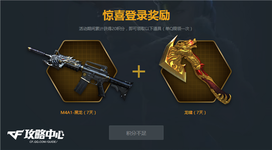 接下来只要我们在活动期间(2017年7月14日到2017年7月27日),每天登录游戏并加入一局游戏即可获得10积分。在活动期间累计获得20积分后,可领取7天期限的M4A1-黑龙和龙啸。需要注意的是,领取它们是不会消耗积分的。M4A1-黑龙作为最先问世的两把英雄级M4A1之一,有着后辈们无法超越的经典之处。而龙啸的重击则是增加了警戒姿态,大大加强了手斧系列的实用性。