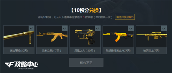 接下来就轮到积分发挥作用了!首先是消耗10积分,可从奖品中进行五选三。其中黄金**作为曾经挑战神器**的皮肤版,虽然如今出场率已经很低,但却承载了我们满满的回忆。凤凰之火作为COP 357的纯皮肤版本,其收藏价值也是极高的。至于联想锋行黄金AK47和破天狂龙与它们的原版相比较也是并无实质性的提升,但它们所代表的意义却是非凡,不知道大家会如何做出选择呢?