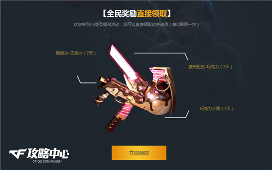 首先是一份全民奖励,只要我们来到界面即可领取。虽然领取门槛较低,但礼包还是十分不错的。包含有七天期限的斯泰尔-巧克力、激光短刃-巧克力和巧克力手雷。作为绝版的武器系列,巧克力武器一直以甜美的外观吸引着无数的CFer。斯泰尔-巧克力虽然只在原版的基础上增加了五发子弹,但也可称得上是如虎添翼。激光短刃换上全新的皮肤后更是能带来不错的手感,而巧克力手雷的爆炸效果也是极其华丽。