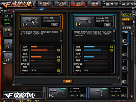 如今柯尔特系列的武器已经很少出现在战场上,但它们曾经也可以说是风靡一时。通过与迷彩沙鹰和恶棍左轮的对比图可以看出,虽然柯尔特-双雄的威力是比不上它们的,但在准确度方面却要略胜迷彩沙鹰一筹,与恶棍左轮基本持平。而左轮曾经之所以深受喜爱,与它那极高的准确度是密不可分的,柯尔特-双雄能做到这一点已实属不易。除此之外,它那每个弹夹26发子弹的装弹数是二者远远不比上的。