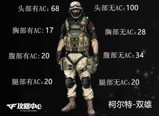 从武器威力中可以看出,柯尔特-双雄的威力虽然不尽人意,但也可称得上是中规中矩。对于无防弹头盔保护下的敌人是可以一击毙命的,而对于装备AC敌人的头部只能造成68-72HP之间的伤害。其对于敌人上半身的伤害最高可达34HP,但在这个AC遍地的年代还是17-20HP之间比较常见。因此在使用这把武器时,应尽量瞄准敌人的头部,不然则需要5-6发子弹才可以带走一个满血的敌人。