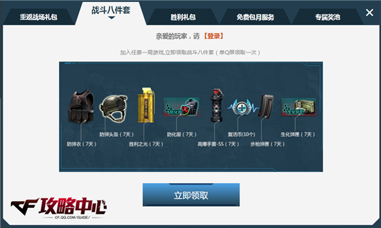 在加入任意一局游戏后可立即领取战斗八件套。虽然都是七天期限的武器道具,但每一件都十分实用。防弹衣和防弹头盔的重要性就不必多说,再配上高爆手雷-SS和步枪弹夹就足以在爆破和团队竞技模式中大杀四方。同样,防化服和生化弹夹对于生化选手们也发挥着不可替代的作用。