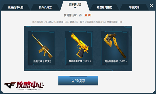 回归玩家累计三天加入任意一局游戏后,还可领取一份胜利大礼包。黄金沙漠之鹰和黄金军用手斧作为老牌黄金武器系列的代表,曾经那无与伦比的身价可是大多数CFer梦寐以求的存在。虽然如今已经随着灵狐的约定这一活动成为了全民武器,但相信它们依旧寄托着一份情怀。而胜利之魂作为M4A1-SS的黄金版本,虽然不曾享受过老牌黄金武器那崇高的地位,但它的实用性却是直追英雄级武器的。