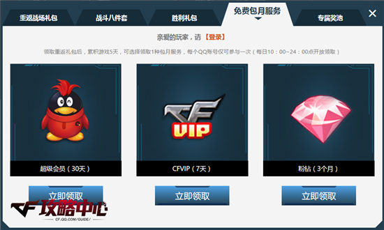 之后累计游戏五天之后,还可在30天期限的超级会员、7天的CFVIP和三个月的粉钻中任选其一。需要注意的是,每天10:00-24:00点开放领取,一定要及时赶来哦。