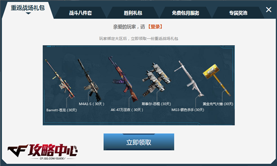 首先只要是回归玩家,来到页面即可领取一份重返战场礼包。其中包含有30天期限的苍龙大炮、M4A1-S、AK-47万圣夜、斯泰尔-恶棍、MG3-银色杀手和黄金充气大锤。M4A1-S作为老牌神器,在许多老玩家心目中占据着都十分重要的地位。当然了,对于爆破玩家们来说一把M4恐怕还不够,如果再加上一把收藏价值极高的AK-47万圣夜和极为实用的苍龙大炮呢?MG3-银色杀手和斯泰尔-恶棍,前者是曾经生化模式中主流武器的代表,后者是如今生化选手们不可或缺的武器。它们的加入让回归玩家们在回忆过往的同时,又可快速适应如今发展的趋势。