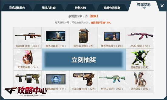 最后则是回归玩家的专属奖池。每天游戏一局之后可获取一次免费抽奖的机会,活动期间最多可抽12次,也就是将其中的奖励统统带走。至于奖池所包含的内容也是极其丰富,头奖则是30天期限的战龙大炮。虽然在毁灭、极光甚至是王者之怒等武器的冲击下,相信钟情于战龙大炮的依旧是大有人在。不仅如此,AK47-樱花、沙漠之鹰-牡丹和M4A1-百合等鲜花系列武器也是加入其中。至于复仇道具卡、堕天使道具卡、强化稳定剂和灵魂忍者这些实用的道具也是十分的吸引人。