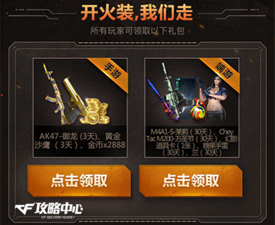 所有玩家来到页面即可领取一份“开火装”。其中不仅包含有30天期限的M4A1-S-茉莉,还有M200-万圣节。前者作为老牌王者M4A1-S的茉莉版本,在继承其优异性能的基础之上,还换上了清新淡雅的皮肤外观;后者在原版M200的基础上每个弹夹增加了3发子弹,使其可以称得上是如虎添翼。糖果手雷作为一款罕见的绝版手雷,不止在外观上能给我们带来浓浓的甜意,爆炸之后更是会有一个超级大的棒棒糖。除此之外,还有一张幻影道具卡,以及30天期限的兰(请忽略图中的夏日之兰)。