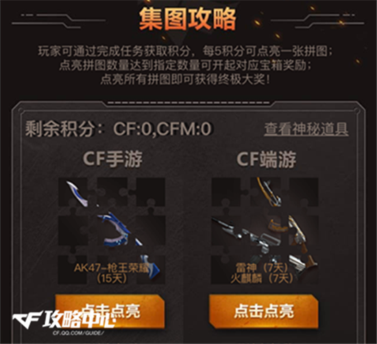 接下来则是“集图攻略”。在活动期间我们可通过完成任务获取积分,每五积分可点亮一张拼图。至于任务也是极其的简单,比如今日的三项任务是:加入任意一局游戏、分享页面和完成一局团队竞技。需要注意的是,任务卡仅限当日领取,而且在每日0点会进行刷新。当点亮所有拼图(即累计完成九次任务)即可获得终极大奖。至于奖品恐怕大家都已经看出来了吧!没错,就是雷神和火麒麟,两款最为经典的英雄级武器。