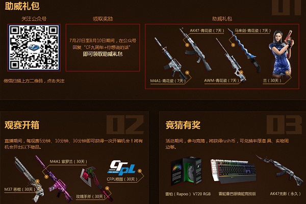 7月20日至8月10日期间,在公众号回复“CF九周年+你想说的话”即可领取助威礼包。直播期间,每观赛5分钟、10分钟、30分钟即可获得一次开箱机会!将有机会开出丰富多样的珍贵道具。