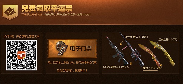 下载掌上穿越火线,免费领取九周年盛典幸运票+道具大礼包!累计登录掌上穿越火线,即可获得幸运门票,此礼包包含多种珍贵枪械和刀具。