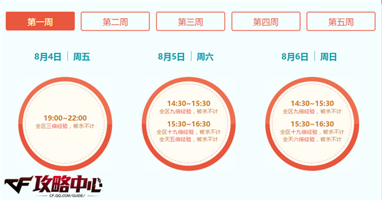 在本月的第一周,由于恰逢九周年庆典,因此会带来十分痛快的经验加成。八月四日为周五,按照往常的惯例在19点到22点之间全区会有三倍经验,并且会被杀不计,本月也不例外。在周六和周日两天,不仅全天都有着五倍经验加成,以及被杀不计。还会在14点30分到15点30分之间开放九倍经验,到了15点30分时更是带来了长达一小时之久的19倍经验加成!需要注意的是,经验加倍是建立在大家所获得的初始经验之上的,而并非是在英雄级武器加成后乘以XX倍。