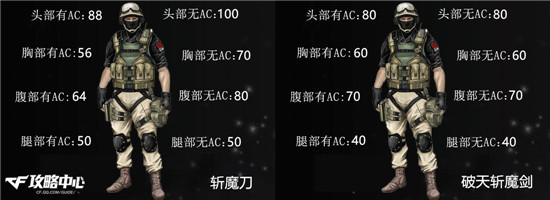从武器威力中可以看出,斩魔刀这把武器轻击的威力则是与尼泊尔军刀、马来剑等基本持平。对于无AC防护的敌人可一击爆头致命,而对于身体的其它部位或是在有AC的情况下则是均需两招。至于破天斩魔剑虽然对于敌人头部的伤害要比前者弱了不少,但相对于上半身时反而高了一些,但也只限于敌人装备有防弹衣的情况下。不过呢,虽然它可以做到无视AC,但也都需要两次轻击才能带走一个满血的敌人。综合来看,还是斩魔刀略胜一筹。注:二者的重击均是一招毙命。