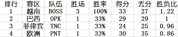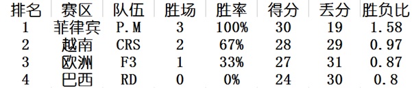 第三名欧洲赛区:欧洲战队的PNT和F3也是一对难兄难弟,两支队伍分别赢了一场比赛,其中PNT是黄金加时险胜OPK,F3也是10:8险胜RD,可以说非常惊险,经历了CFPLS10的洗礼,两支欧洲战队暂时还未将所见所学融入到自己的战术体系当中,本次比赛发挥得不尽人意,但好在两支战队各自战胜了来自巴西的两支队伍,这也是将欧洲战队排在巴西前面的原因。
