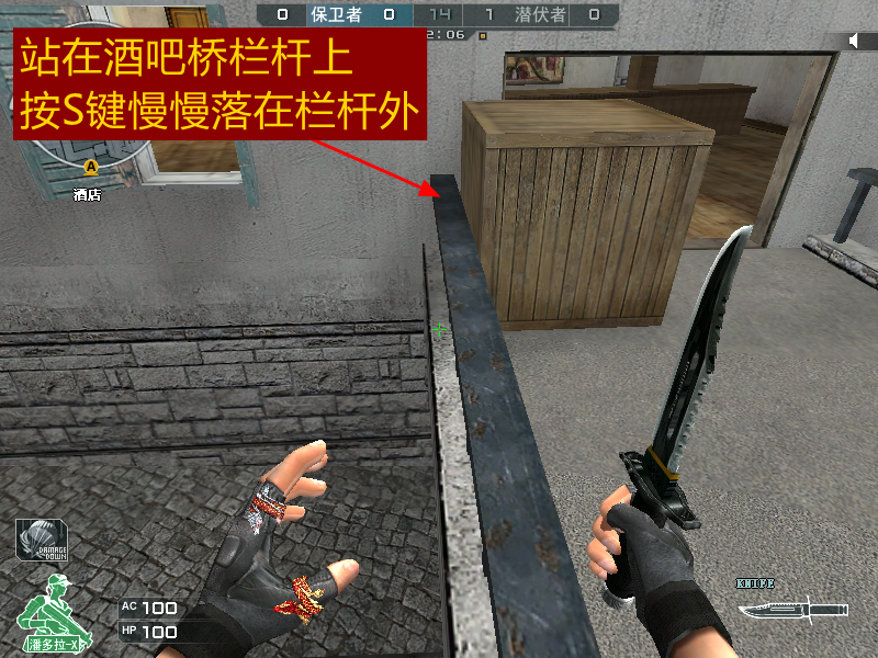 想要在这个点位架点,需要我们在酒吧桥栏杆上往下缓缓移动。如上图所示,站在酒吧桥栏杆上,接着背靠酒吧,按S键慢慢落在栏杆外即可完成操作。