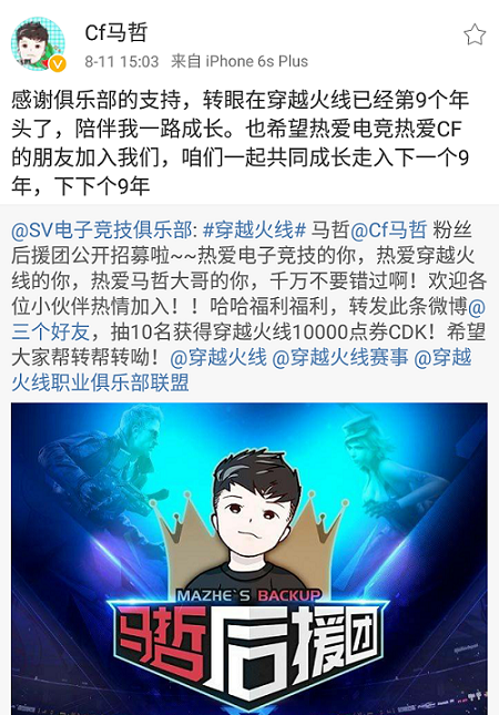 前段时间,白鲨在微博上发文宣布成立后援团,給广大喜爱白鲨的粉丝有近距离接触白鲨的机会。近日,马哲在白鲨后再成立后援团,相信这是收到了白鲨的影响和启发。马哲在微博中説到:“希望热爱CF的朋友加入,咱们一同成长,走过下一个九年,下下一个九年。”喜欢马哲的你,还不迅速加入马哲后援团?