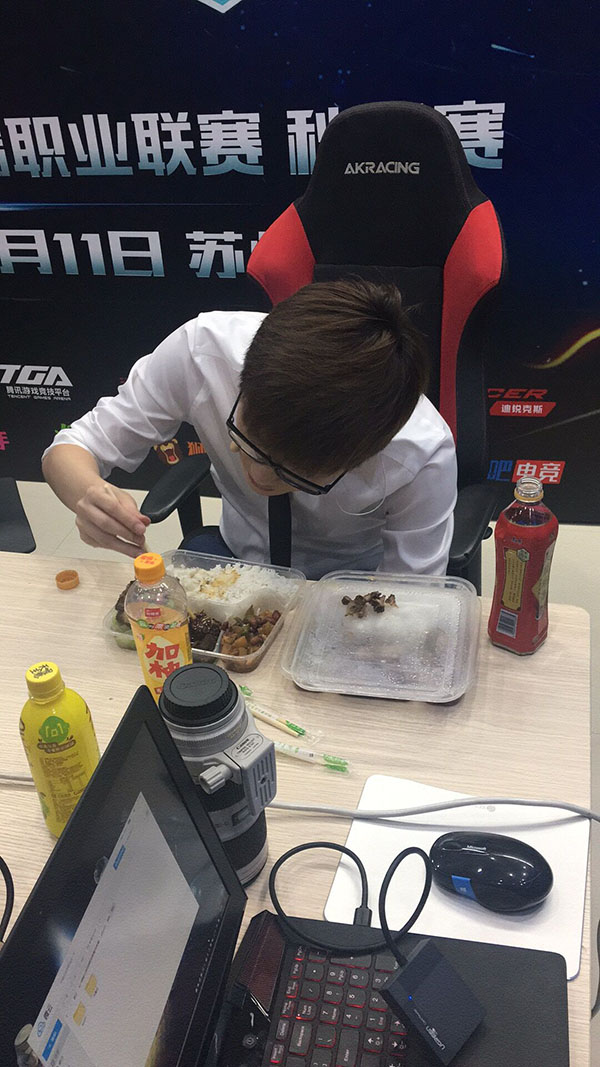 为了给观众良好的体验,解说们也是付出颇多,白鲨趁着休息的一会时间,忙里偷闲吃上几口盒饭,这期间白鲨还不忘与工作人员交流,实在要给他的敬业点一个赞!
