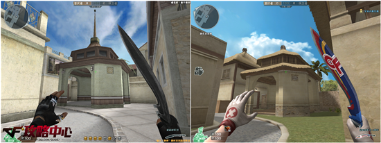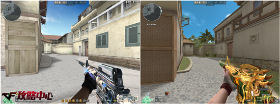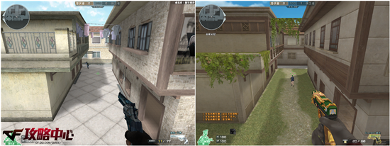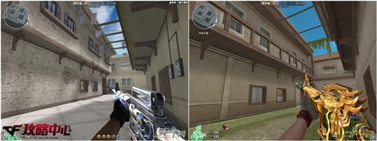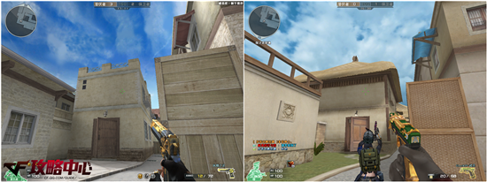 在复活点一旁的凉亭也是整张地图比较有特色的建筑。在优化之后去掉了屋顶那高耸的装饰,并且在颜色方面与四周建筑相协调。再配以墙外的椰子树等,更能让我们感受到浓郁的热带风情。至于天气方面,这里在优化之后就明显地给人一种万里无云之感,仅仅是看起来就让我们心旷神怡。