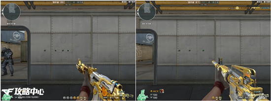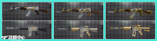 由于二者的初始形态与GP版的AK47和M4A1完全相同,故不在此进行对比。当二者的等级达到LV2时,会进行一次较大的外观转变。AK47则是装备上了它那标志性的刺刀,而M4A1则是戴上了消音器。到了LV6时,二者枪身上的图案更是变得华丽了许多。暂且不提它们枪身上那金色的纹路,单是AK47弹夹上的装饰和M4A1枪身上的雄鹰标志都额外增加了几分细节之美。到了LV10,也就是最终形态,皇家骑士在拥有金色外观的同时,枪身上还有转动的齿轮,这点与沙鹰-天神不谋而合;而皇家雄鹰虽无动态效果,但其外观直逼玫瑰精灵。