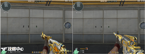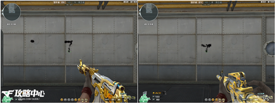 在等距离的情况下,这二者的单发点射都十分的精准,子弹基本上都分布在准星的正中央。而在进行三连发时,它们的之间的差异就渐渐突显出来。皇家骑士的前两发子弹分布得还算密集,到了第三发上扬的趋势就明显了很多;而皇家雄鹰的前两颗子弹基本上打在同一点上,第三发只是略微地有些偏移。至于二者的站立无压枪连发扫射弹道,前者依然是AK家族标志性的“7”型弹道,后者依然是“T”型弹道。想必大部分CFer都不会对此感到陌生吧!