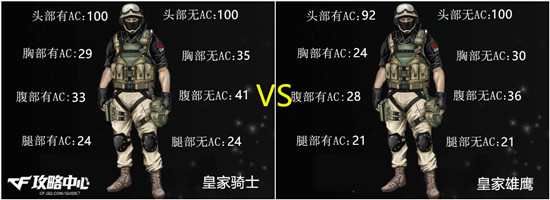 从武器威力中可以看出,皇家骑士和皇家雄鹰则分别继承了AK家族和M4家族在这方面的所有优劣。皇家骑士依然有着一枪破盔的能力,并且对于敌人的上半身最多只需要四颗子弹就能将其满血带走。而皇家雄鹰虽然在敌人没有装备AC的情况下也能感受一颗子的快感,但在这个AC遍地的年代还是经常造成90多HP的尴尬伤害值,不过皇家雄鹰依然在穿透伤害方面占了很大的优势。综合来看,这二者在威力方面各有千秋。虽然皇家骑士的威力较大,但皇家雄鹰的穿透伤害也不容忽视。