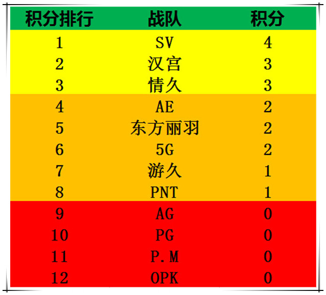 可以看出,上周积分情况明显氛围三个层次,SV战队全取4分,领跑积分榜,汉宫情久双双翻车,但也拿下三分,AE、东方丽羽、5G仅得两分由于参赛场次仅有一场次,游久和PNT分别在情久和汉宫身上抢回一分,AG、P.M和OPK由于一场败未积分,而期予厚望的PG在首轮磨合不佳,两场全败未积分,希望发挥得较好的队伍再接再厉,发挥不好的战队好好总结,争取在接下来的比赛中翻身。
