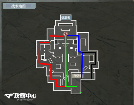 如果选择从红色路线进攻的话,虽然绕的远了一些,但相对来说比较安全。从复活点出发后首先可以来到左侧的小屋内,由于离我方复活点较近,一般不会有敌人埋伏在里面,当然了超逆风局除外。之后就来到了行政室二楼,这条楼梯看似隐蔽,实则杀机重重,一定要当心正前方或者是右侧的墙角。如果能够顺利通过的话,就来到了与实验馆的连接点,此处已经处于保卫者的地盘,在确保安全的情况下要尽快前进。最后则是来到了突围点右侧的小屋内,在这里我们可以先观察突围点附近敌人的埋伏情况,然后将威胁较大的敌人解决后再迅速突围。
