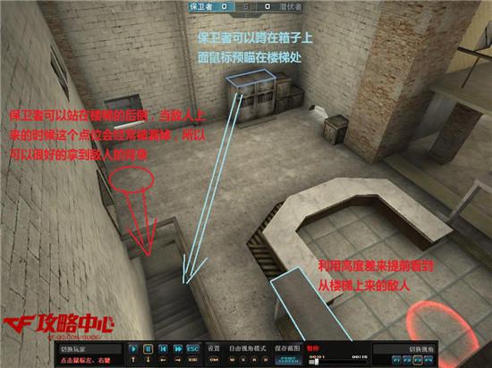 如下图,保卫者可能会在圈出来的这么位子布置守包人员,一旦他们确定了我们在楼梯的位子那我们钻出去就只能吃到一堆枪子,所以还是不建议大家从楼梯进入B包点了。但如果你是经验丰富的矿场老司机的话,你也不妨可以试试看哦。