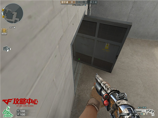 或者可以站在如下图的位置,也是一个不错的选择,打对方一个出其不意。许多保卫者玩家会以为潜伏者会比较喜欢卡在门后面的位置,然而这次我就反其道而行之,卡在门的侧面给他一个大大的surprise。