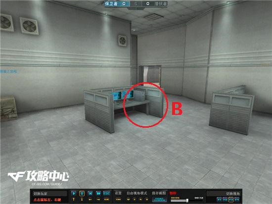 在A点包点防守的潜伏者,如果幸运的有3个人或以上存活了下来的话,建议在如下图三个地方布防。A位置和B位置是可以互相配合来打从中路进入A点的敌人,同时在保卫者家方向的队友可以摸过来打一个背身。
