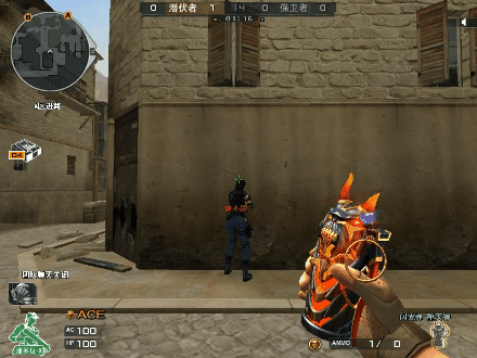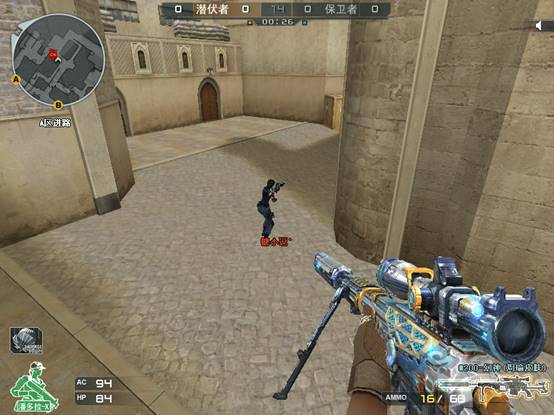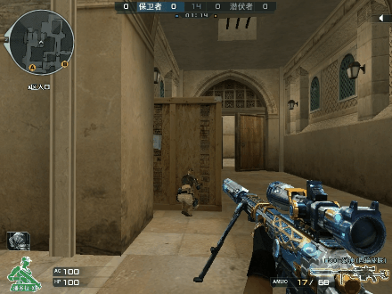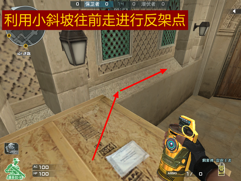与直接从A门前顶对比,站在上方小斜坡反架点更加出其不意,敌人也肯定想不到我们会从这个位置出现,这对作为保卫者的我们前顶A门非常有利。