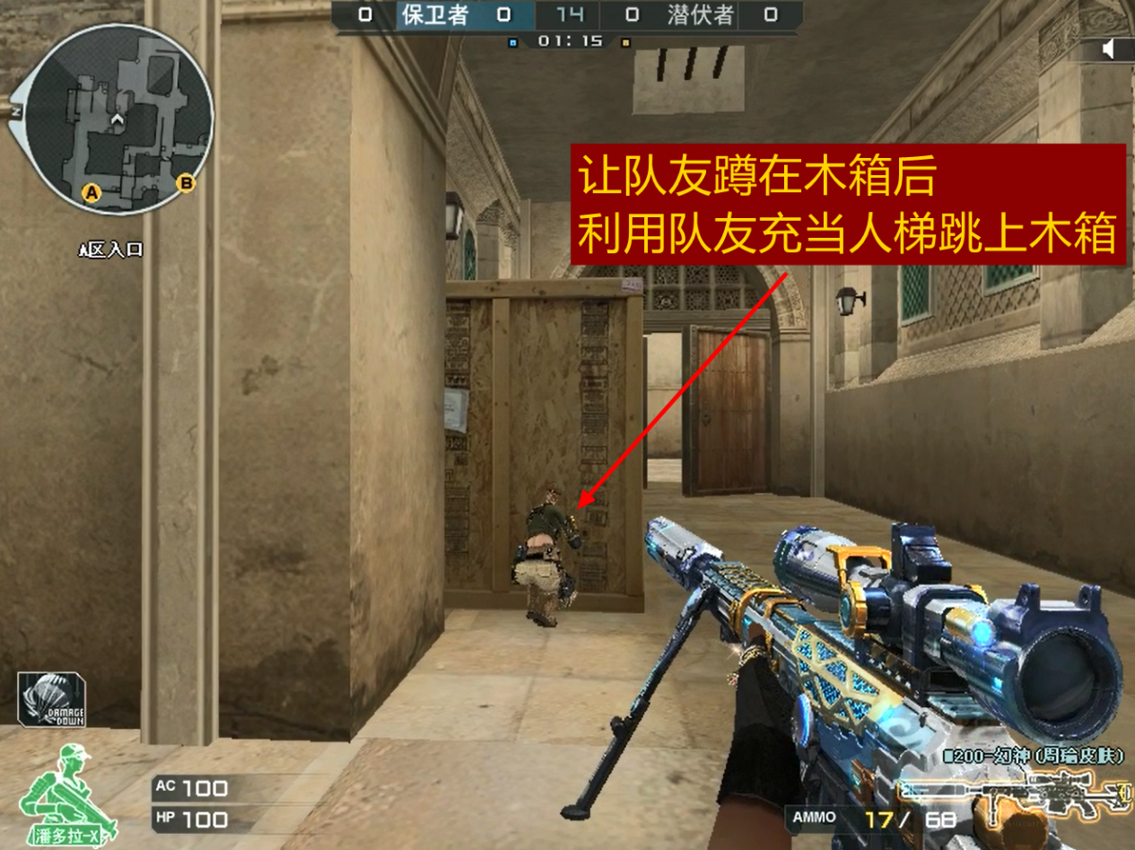 我们可以在一个非常规点位进行一个反架点。如上图所示,当我们前顶到A拐位置后,可以让队友蹲在大木箱后,我们利用队友充当人梯跳上木箱。
