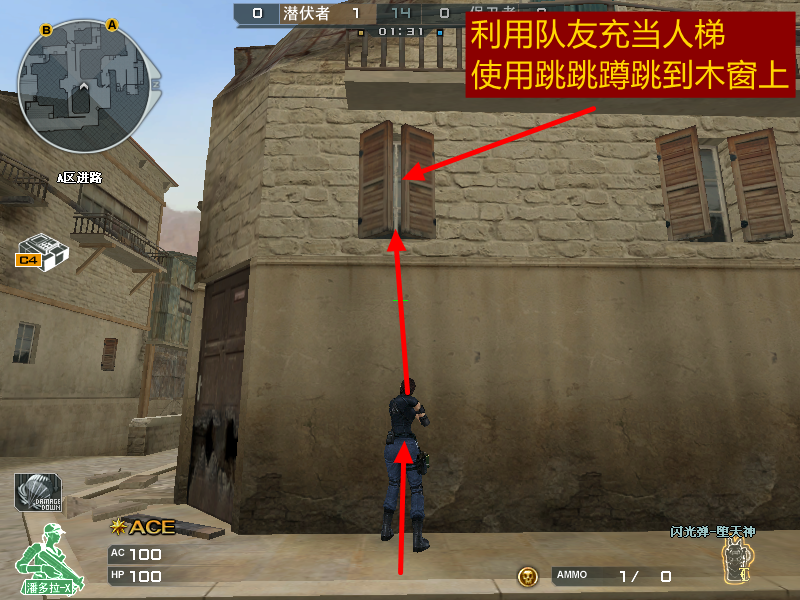 如上图所示,想要在中路木窗位置架点的话,需要队友配合我们。开局后让一名队友站在中路木窗下方,我们利用队友充当人梯,使用跳跳蹲身法跳到队友头上,接着再按跳蹲键即可跳上木窗。