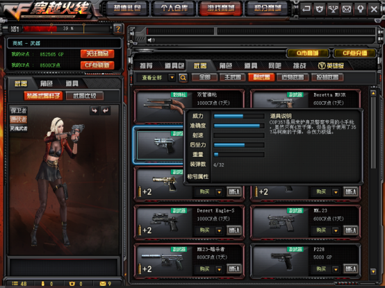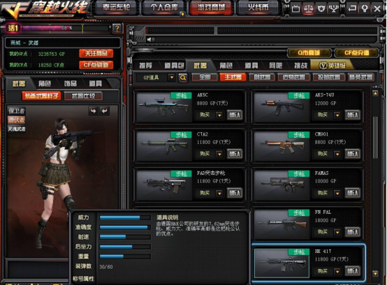 (CF2.0前)玩家注册游戏,进入后无一例外的赠送定额的GP点和新手三件套(M16等),想要进行游戏,你可以直接使用M16进行作战,当然了,买枪,也只有35000可供使用。