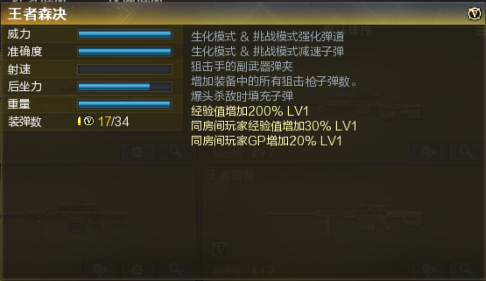 王者森决具备王者武器的属性激活功能,激活后可以拥有强悍的挑战和生化属性,而对于PVP玩家来说,狙击手的副武器弹夹属性也是格外的实用,所以王者森决在属性激活之后也将是适用于多种模式的一款武器。