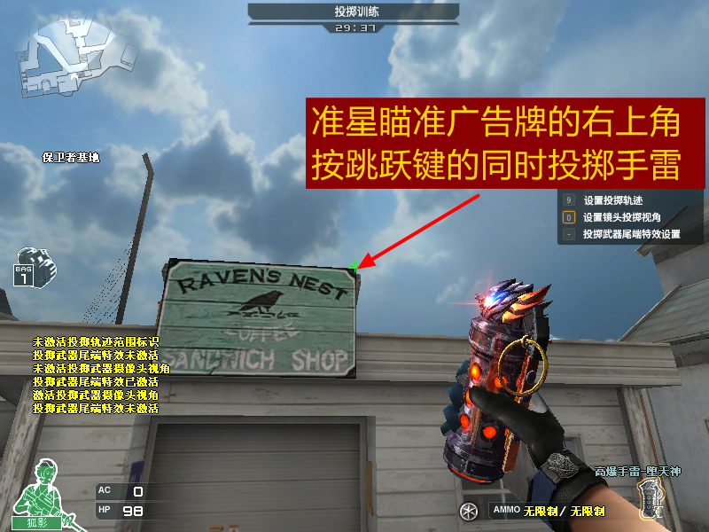 当我们就位后,将准星瞄准上图所示绿色广告牌的右上角位置,接着进行跳投,按下跳跃键的同时投掷手雷即可。