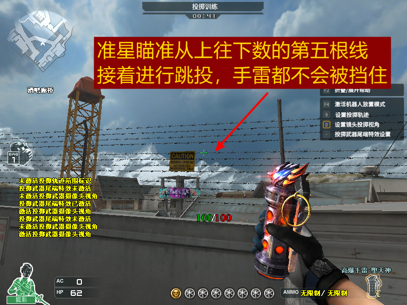 如上图所示,我们可以来到酒吧桥大木箱子上,接着准星瞄准上图红色箭头所示位置,也就是从上往下数的第五根铁丝线,当我们找准参照点后,进行跳投手雷即可,手雷都不会被铁丝网挡住。
