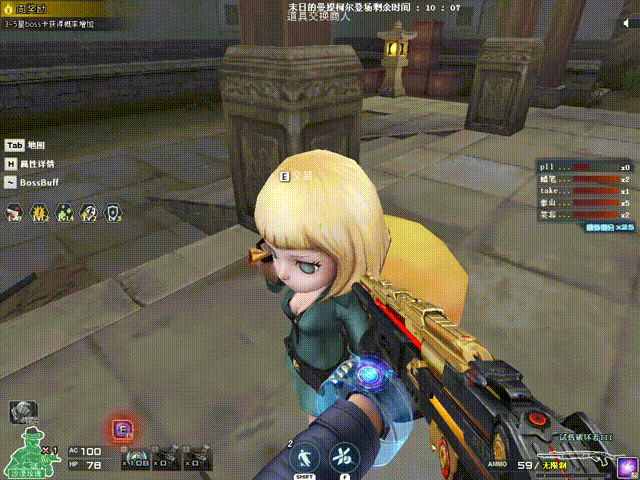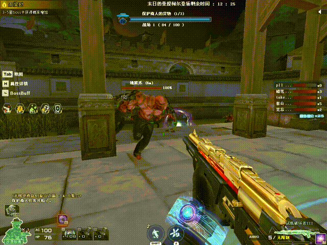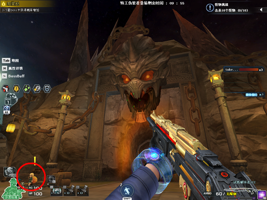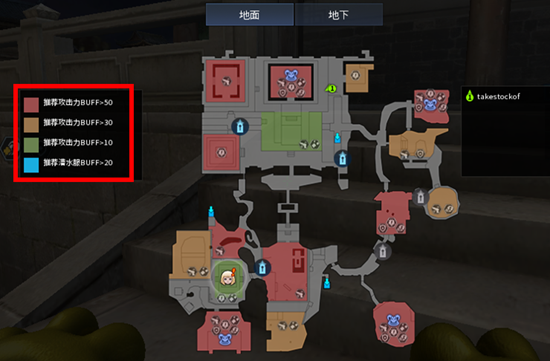 Tab键地图显示也做出了一些优化,如上图所示加上了一些文字提醒,推荐攻击BUFF>10为绿色区域,30和50分别是橙色和红色区域。