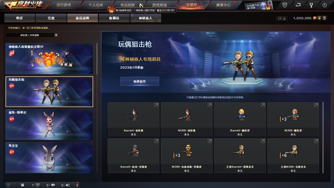 (以下均为体验服版本内容,具体请以正式服上线为准) 哈喽,各位小伙伴们大家好呀~又见面啦,在新版本中CFer即将迎来神秘商人的第6次开市,本次开市也将给CFer带来全新的玩偶狙击枪随机宝箱。