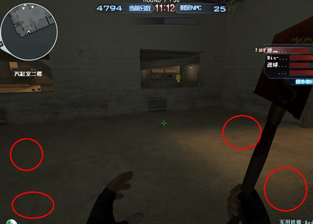 引小怪的方法,如对着小怪身上或者脚上扫几枪,别打死,打死又会刷新。然后带去截图中标记的地方绕圈圈跑就行了。基本可以无损耗。屋子里的三人可以分为2组,A组2个人,专门打BOSS,注意别被BOSS打到就行。B组一个人,清理漏网而跑过来的小怪即可。这样基本打BOSS是无损耗的。