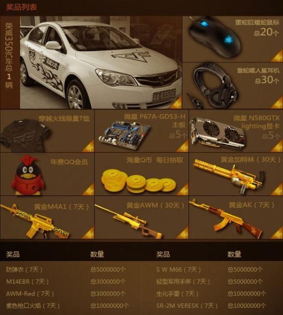 尊贵典范荣威350轿车、微星N580GTXlighting显卡、顶级雷蛇外设、贴心CF绝版T恤,更有海量QB、黄金系列超值武器等你来拿!