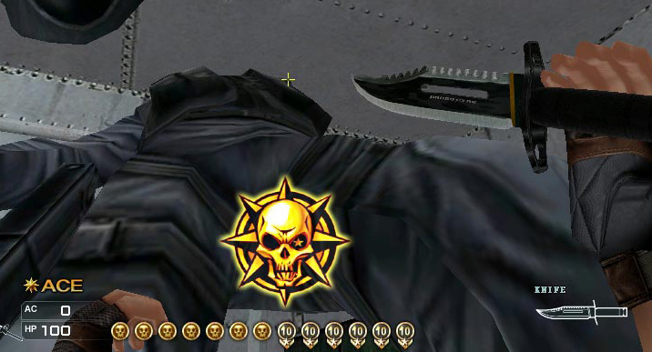 对手蹲下时一般为典型的camper,不会注意到身后,在攻击对手前需要在普通模式下提前划一刀,当近的距离伸手可触及对手头部时,准星略为压低划第二刀。前面提到,这一刀攻击曲线是向右上方斜刺杀,这就决定了这一刀的爆头率相当高,会减少对手80的HP,一般到后半局这一刀足以毙敌,即使对手满血,之后迅速补上的一刀刚好为20的伤害值,完全可以做到秒杀。另外关于匕首爆头与穿避弹衣的关系要说的一点是,可能避弹衣顾名思义,仅为避弹之用,对于冷兵器的匕首并无用途,匕首攻击部位为头部时,伤害值保持不变,与对手是否穿戴头盔避弹衣并无关系。