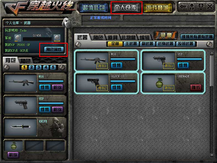 “角色属性”按钮是玩家查看自己角色属性信息的重要入口。在旧版本中,玩家必须进入个人仓库才能找到该按钮,这给许多新手玩家带来不便,如图: